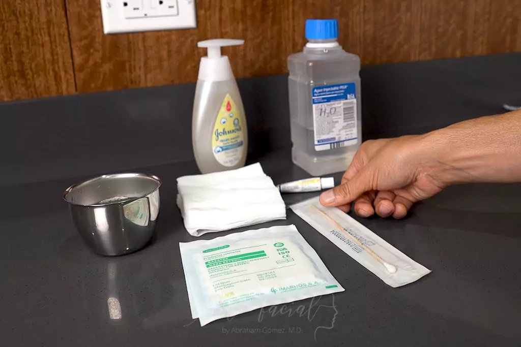Es sumamente importante mantener las heridas libres de residuos, limpiando cuidadosamente la zona dos o tres veces al día. Para ello, recomiendo diluir una pequeña cantidad de champú para bebés en agua tibia, empleando un recipiente limpio. Moje una gasa limpia con agua y jabón y limpie la incisión dando palmaditas suaves en el área operada. Es importante evitar raspar la superficie de la piel, ya que esto puede abrir fácilmente la herida. Posteriormente, seque con cuidado la herida con una gasa limpia y suave.