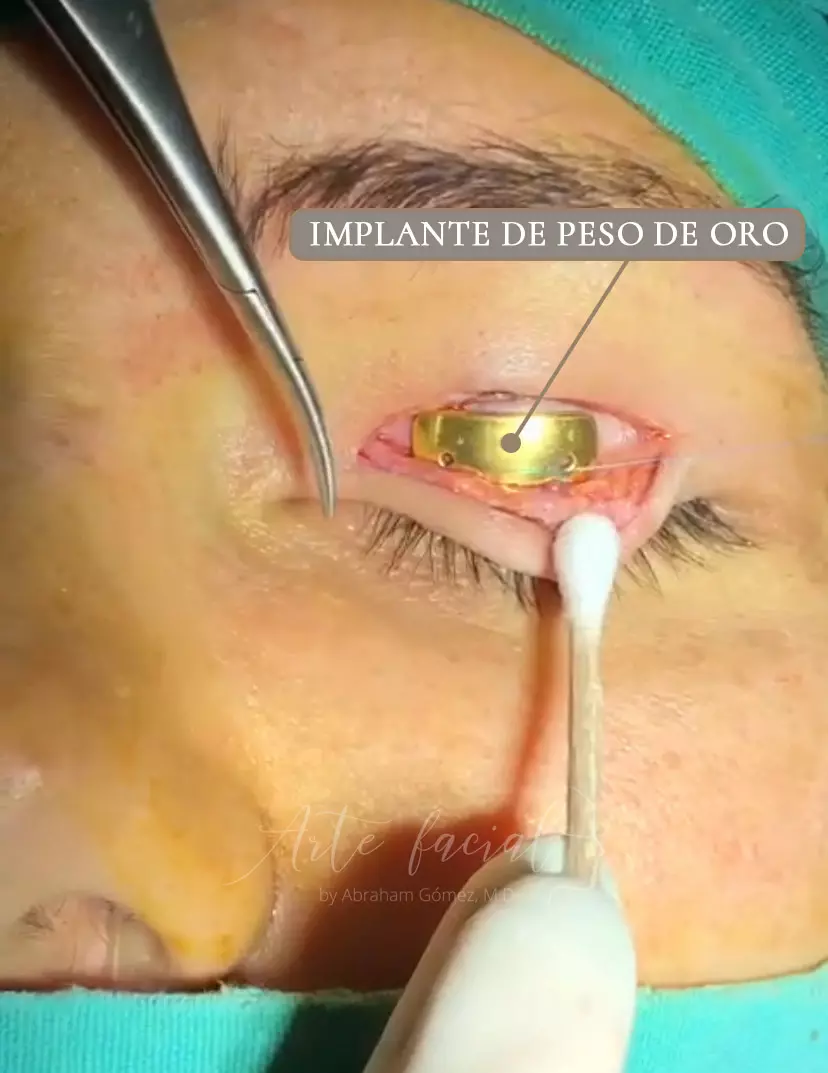 La colocación de un implante de peso de oro o platino es actualmente la mejor opción para corregir el lagoftalmos paralítico, la secuela ocular más peligrosa de la parálisis facial. Lagoftalmos es el término empleado por los oftalmólogos para referirse a la incapacidad que tienen estas personas de cerrar por completo el ojo afectado por la parálisis. El parpadeo incompleto deja expuesta la superficie de la córnea, lo que implica un riesgo importante para la salud visual. Un implante del peso apropiado le permitirá a la persona cerrar el ojo sin dificultad.