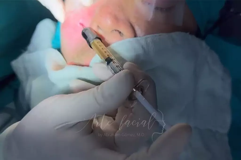 Facial fat transfer is a critical component of the operation. Fat is harvested from the abdomen or thigh and carefully processed before being transferred onto the cheek with infiltration cannulas specially designed for this area.