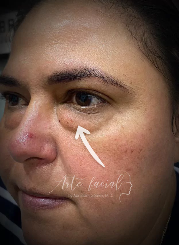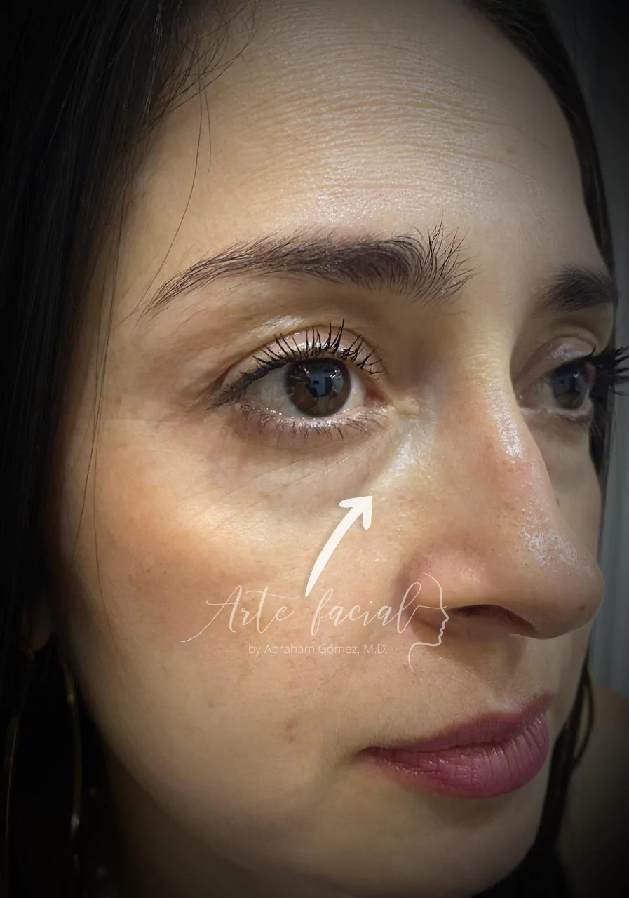 Un tercer elemento que debería abordarse en la blefaroplastia inferior son las ojeras, específicamente el surco nasoyugal o surco de la lágrima. Este es un hundimiento entre el párpado y la mejilla que provoca una apariencia cansada y envejecida. La lipotransferencia es una excelente alternativa, ya que funciona para rellenar la depresión y mejorar la calidad de la piel. En ocasiones, es preferible realizar una cirugía mediante la técnica de transposición de grasa de la órbita al pómulo.